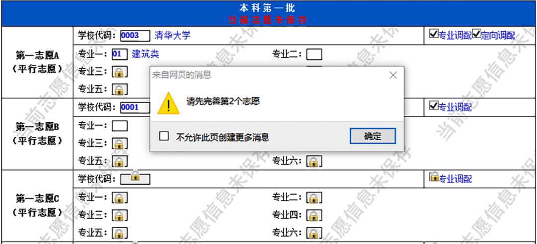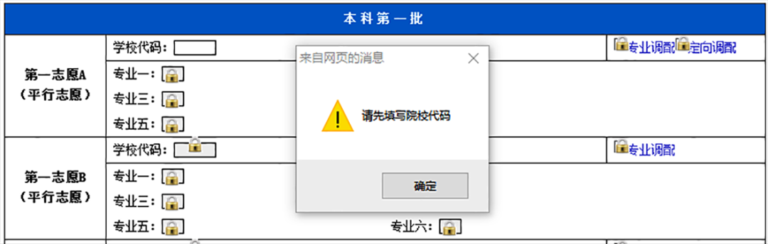 若所输入的学校代码和专业代码不存在,或者虽然存在该学校和专业代码,但该学校专业并不在考生当前所填写的志愿批次招生,则系统会提示如下: