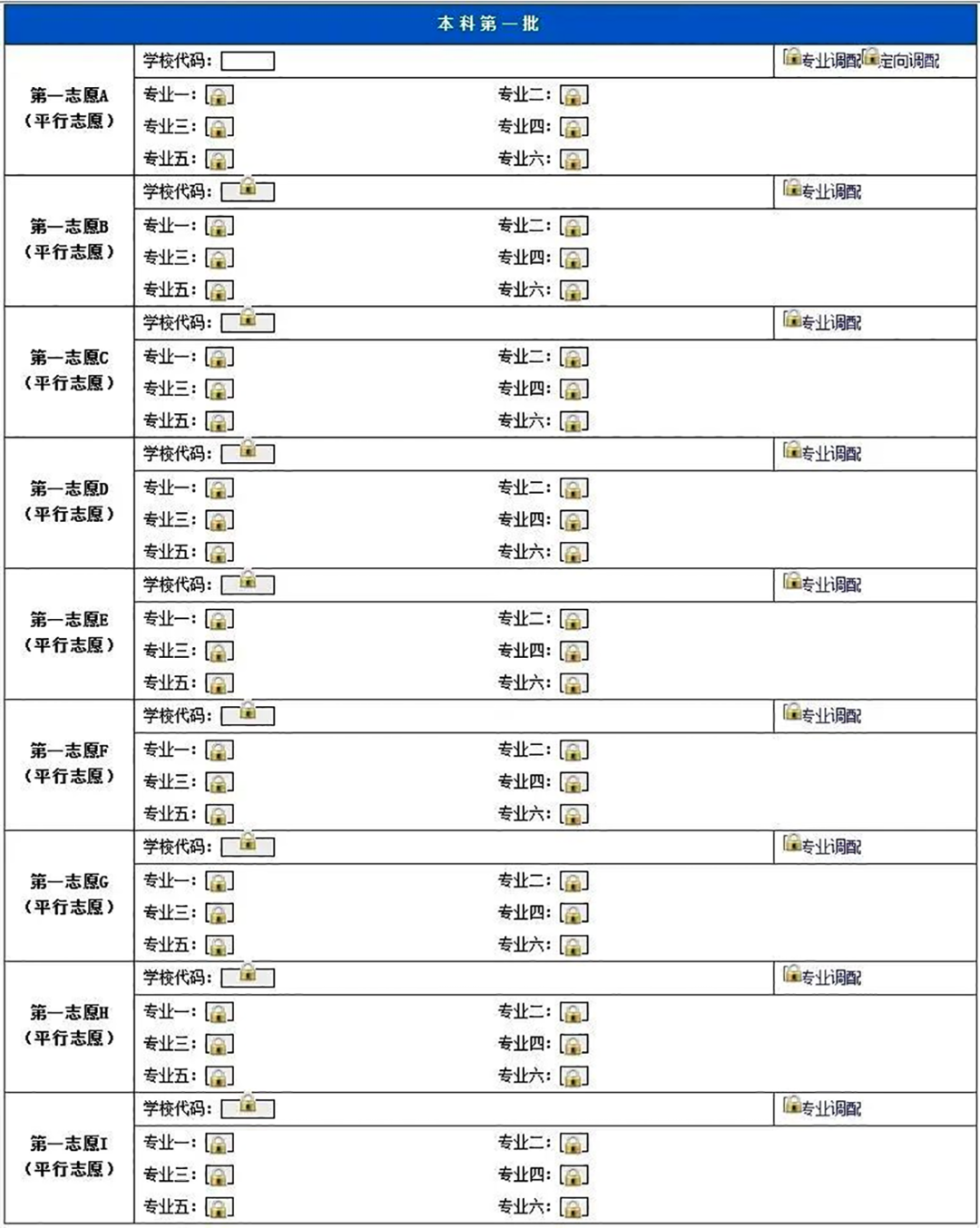 填写志愿时为了避免出现填写信息不完整的情况,系统采取了强制约束填写顺序(暂不能填写的志愿是锁定状态),没有填写一志愿不能填写二志愿;填报了某个学校,却没有填写具体的专业,也不能填写下一个志愿。填写专业时,也要按专业顺序进行填写。没有填写每个志愿的学校,也不能填写其相应的专业。