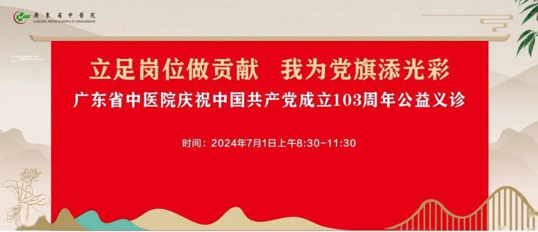 为庆祝中国共产党成立103周年,继承和发扬党的优良传统,贯彻和践行以人民健康为中心的发展理念,持续开展“我为群众办实事”活动,7月1日,广东省中医院(广州中医药大学第二附属医院)多学科100位专家将在大德路总院、二沙岛医院、芳村医院、大学城医院、珠海医院、贵州医院同时开展以“立足岗位做贡献 我为党旗添光彩”为主题的大型义诊活动,以满足人民群众日益增长的中医药需求,增强群众自我健康意识,提高群众疾病预防能力,为粤港澳大湾区医疗高地建设和健康中国贡献力量。