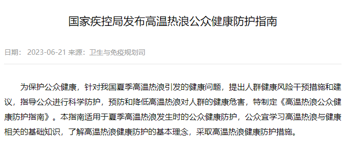根据国家疾控局发布的《高温热浪公众健康防护指南》,高温热浪可直接引起热疹、热水肿、热晕厥、热痉挛、热衰竭和热射病等热相关疾病,威胁人体健康。特别是儿童、孕妇、老年人等敏感人群,慢性基础性疾病患者人群在高温热浪下需加强自身防护。