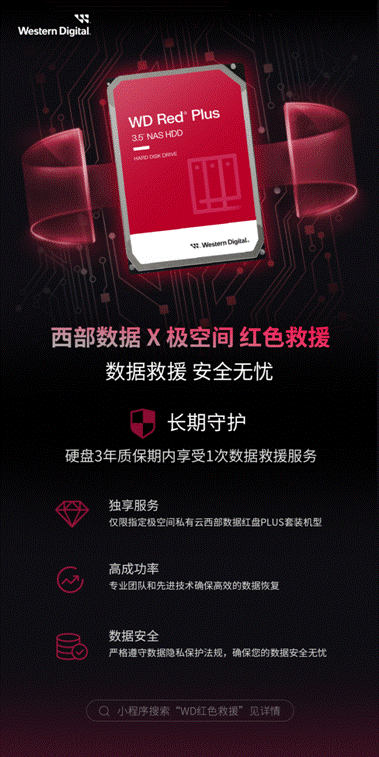 据了解,西数旗下专为NAS打造的西部数据红盘 WD Red系列产品,是针对家庭、办公室用户、中小型团队和大型企业推出的高端存储产品。极空间私有云在NAS行业深耕网络存储事业数年,早已成为行业领头者,为众多个人和家庭提供多款品质口碑上佳的私有云系列产品。双方数年来一直保持长期稳定战略合作。“红色救援”业务将利用西数在存储解决方案领域多年的技术积累和专业知识,为购买指定极空间私有云机型的用户提供全面的数据恢复服务。此项服务针对中国大陆地区提供,为消费者进一步提升数据安全,提供更贴心的安全服务。
