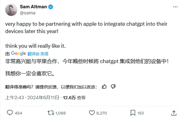 OpenAI的CEO Sam Altman,通过推文表达了对与苹果合作的兴奋,并表示用户将会喜欢这一新整合。