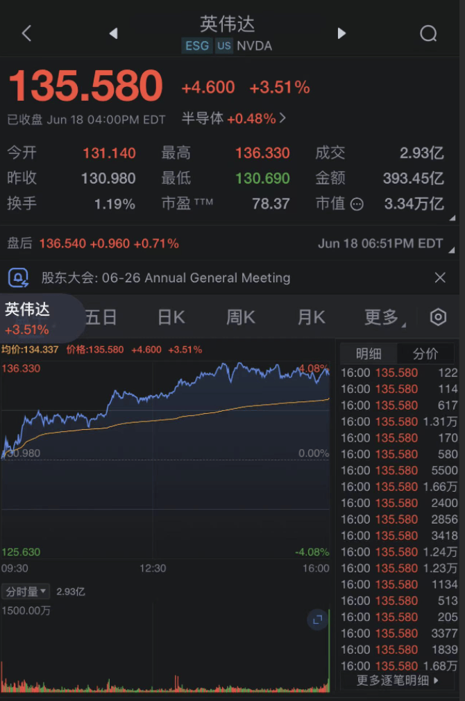6月19日凌晨,人工智能芯片巨头英伟达收涨3.51%报135.58美元,市值一度涨到3.34万亿美元,超越微软称为全球市值最高的公司。微软市值为3.32万亿美元。