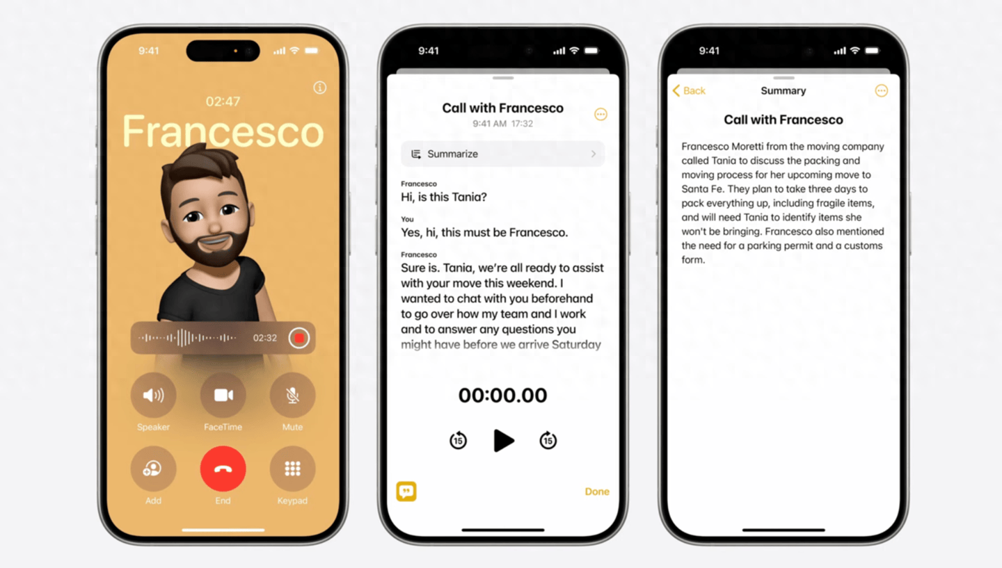 其次,具体的AI功能,iOS18在邮件、Pages、备忘录以及第三方App等中都内置了全系统范围协作工具,覆盖所有场景,都可以实现一键校对语法、重写以及检查错别字等。而且在“备忘录”和“电话”之中,很多小伙伴所期待的“通话录音”功能也安排上了。根据官方介绍,在通话时是可以启动录音功能的,而参与者也会自动收到通知,相关音频能够实现录制、转录或总结。在整个通话结束后,Apple Intelligence功能还能够生成重点摘要,这个功能还是相当实用的,尤其在接听领导电话时,能够把重点都圈出来。