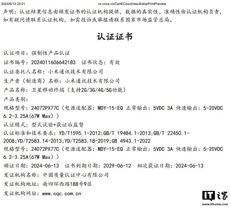 如图所示,这款机型申报名称为卫星移动终端(支持 2G / 3G / 4G / 5G 功能),标配 67W 的 MDY-15-EQ 充电器。