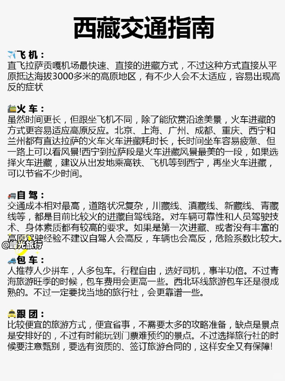 自驾:第一次来西藏、驾驶技术不是特别好的朋友们不建议自驾西藏各个景点之间相隔较远,自驾开车容易迷路或者是高反就不好了还有就是西藏公路超乎想象的大弯道,公路有时候比较崎岖,不熟悉路况狠容易踩坑跟团:个人建议来西藏还是跟团比较好,建议选纯玩小团,比较自由方便,当地人开车还有保障玩的还是挺不错的