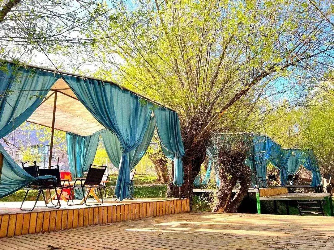 露营地绿化极好,大大小小的各式帐篷散落在绿树浓荫中,有咖啡、烧烤、火锅等餐饮。来这里过林卡可根据需求自带食物,也可以直接在此点餐。每晚8点左右,露营地会燃起篝火,人们围着篝火跳锅庄,让过林卡的体验感瞬间拉满。