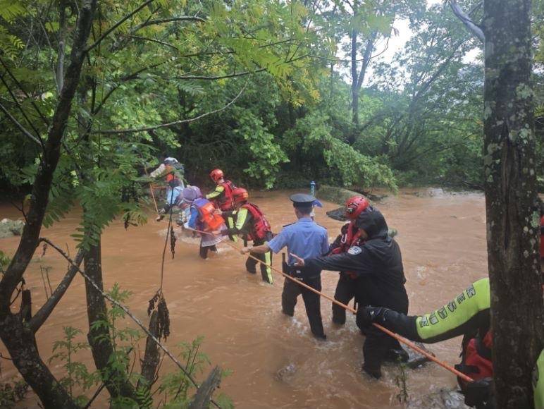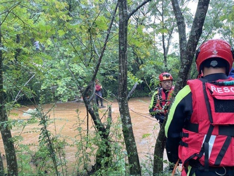 宜良县消防救援大队介绍,6月23日17时04分,消防部门接到群众报警求助,称“三角洞”附近由于下雨导致河水上涨,4名旅拍人员被困河对岸,需要救援。接到报警后,宜良县消防救援大队温泉路站出动2车10人赶赴现场处置。