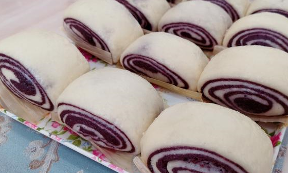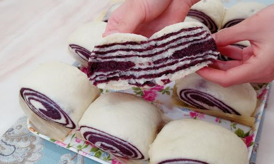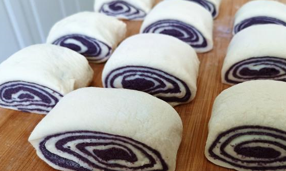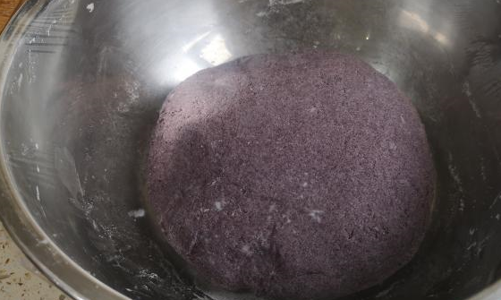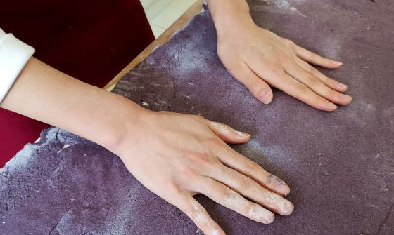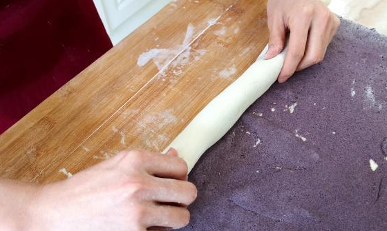 7.再把黑紫米调的面简单揉一下,排气,排好气以后,擀成长方形。