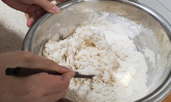 2.盆内加入5克酵母粉,用温水将酵母粉融化,加酵母水来和面,边加水边搅拌,搅拌至剩余少量干面粉时,下手揉成面团。