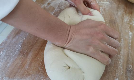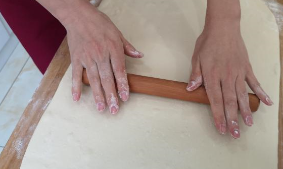 6.面排好气后,按压一下,用擀面杖擀成长方形。