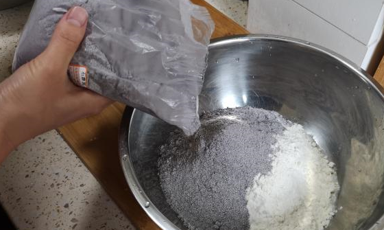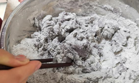 1.盆里加适量的白色面粉,再加点黑紫米粉,比例1:1就可以,搅拌均匀。