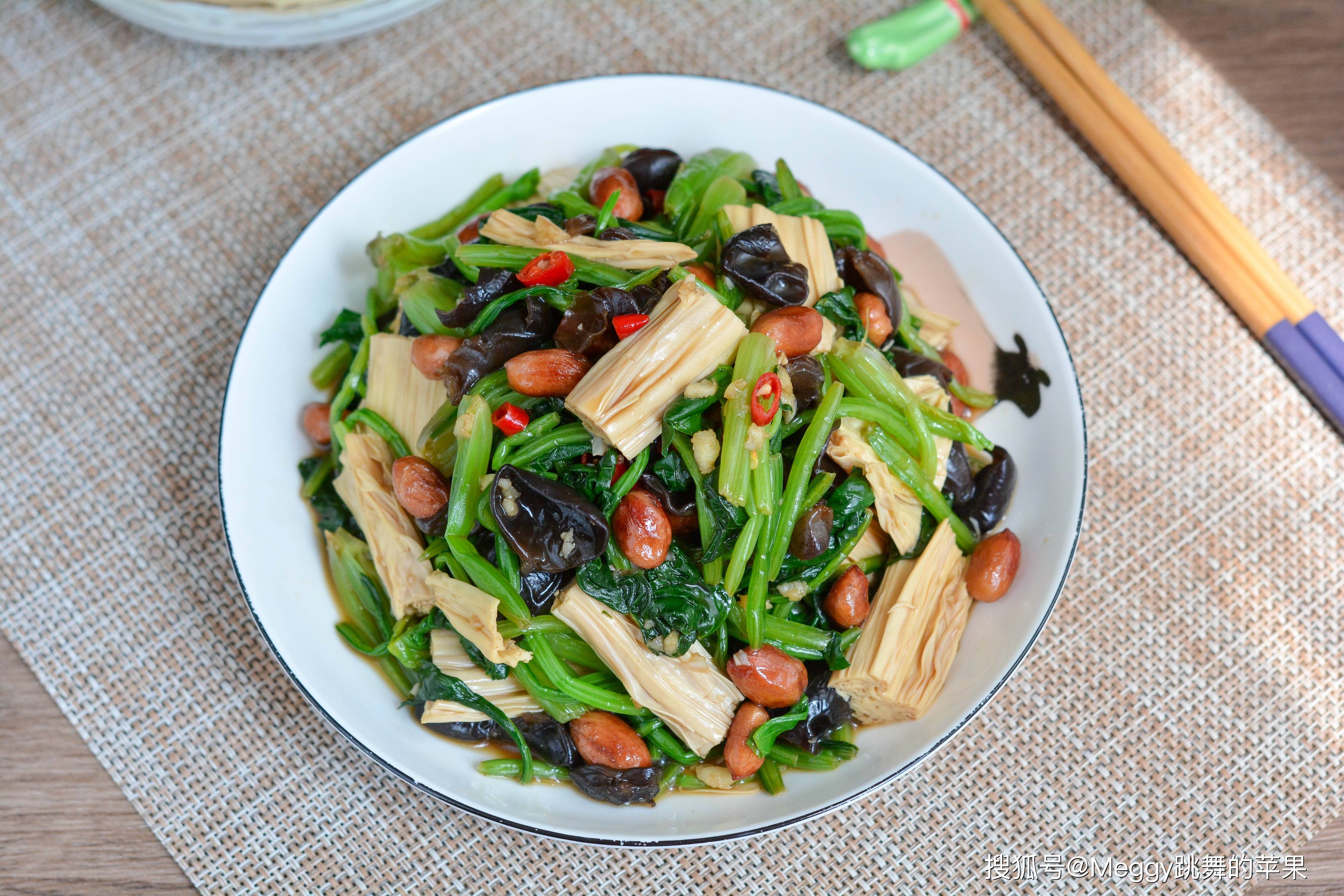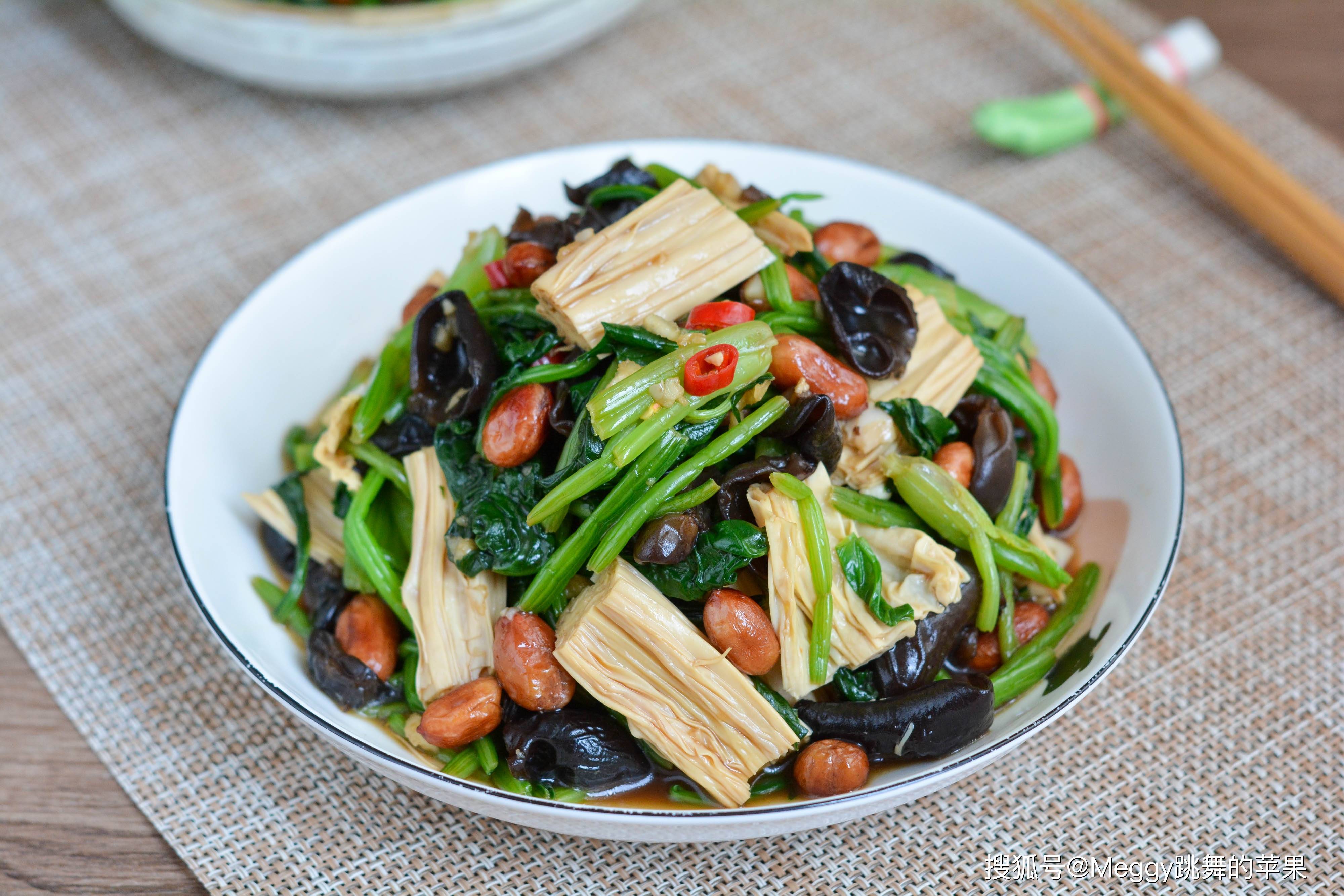【材料】 菠菜,腐竹,木耳,油炸花生米