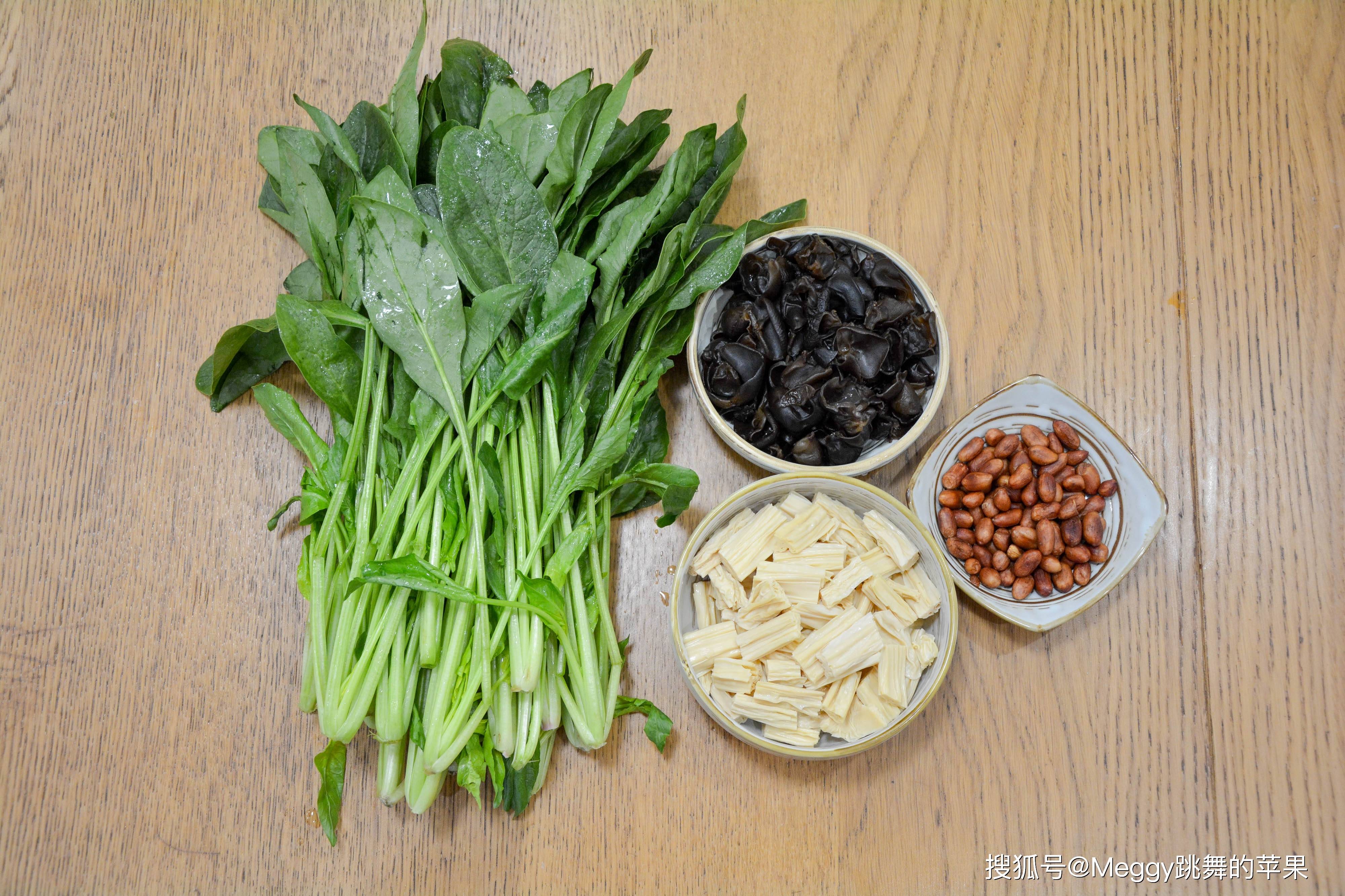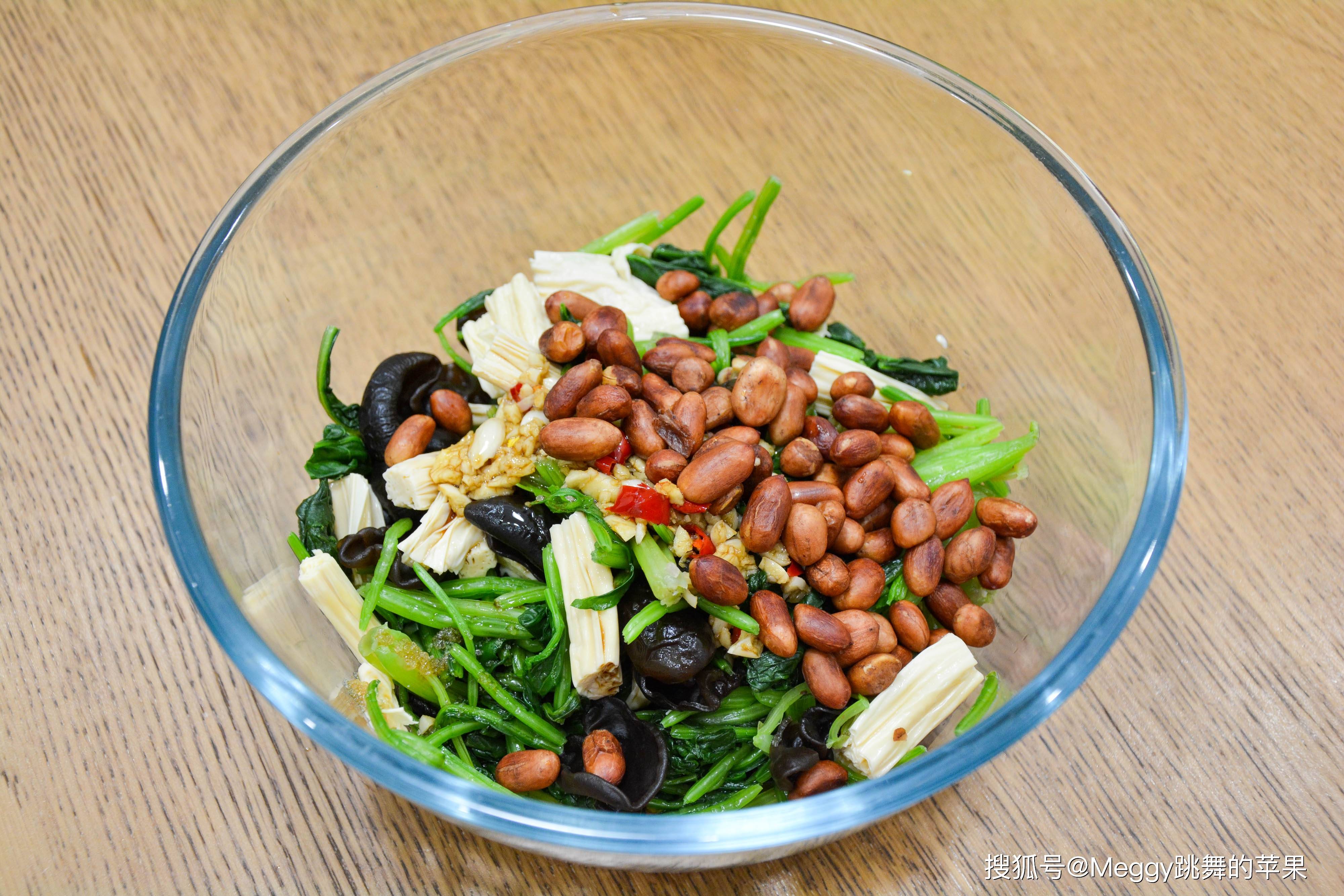 菠菜富含植物纤维,清香脆嫩,特别适合凉拌;腐竹富含植物蛋白质,口感微弹;木耳含铁特别多,还有“肠胃清道夫”的美誉;而花生米又是经典的下酒下饭食品;这几样搭配做成的小凉菜,尤其夏天食用,省事又开胃。