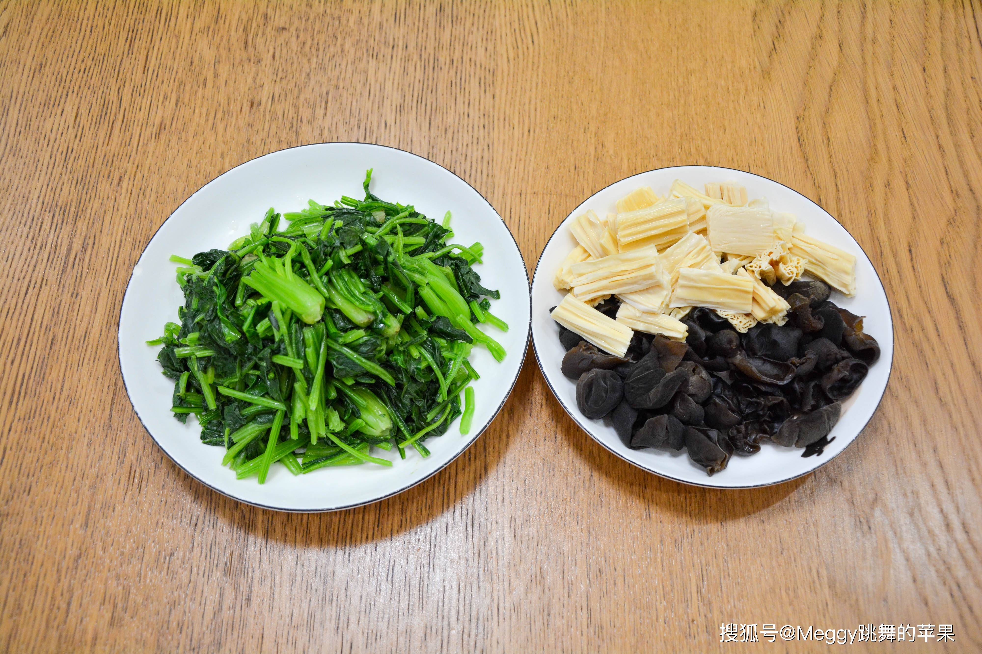2. 菠菜切寸段,入开水锅,焯烫变色,捞出后过两遍凉水,攥干;腐竹入开水锅焯烫30秒;木耳入开水锅焯烫1分钟;捞出后抖散,自然晾凉,无需过凉水;