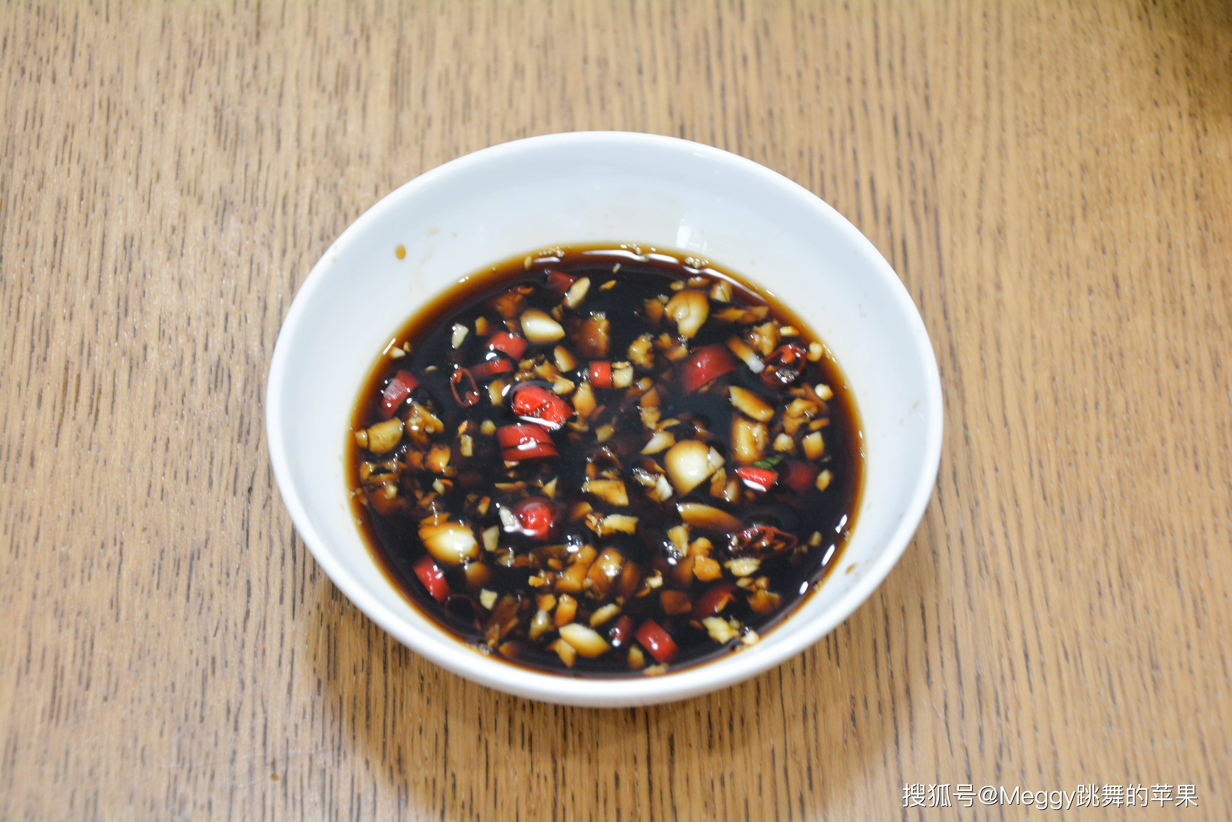 【调料】 小米辣2根,大蒜5瓣,小葱1棵,薄盐生抽20克,老陈醋25克,油泼辣子15克