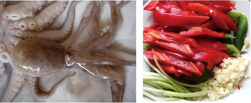 活巴蛸300g,青椒1个,红椒1个,酱油20g,大葱5g,生姜3g,大蒜3g,食盐4g,味精1g,花生油30g。