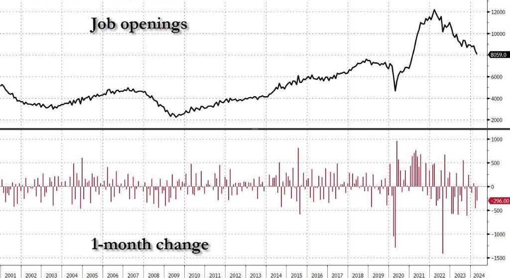 美国劳工统计局周三公布报告显示,该国4月的职位空缺降至三年多以来的最低水平,大幅不及预期。最新的JOLTS数据印证了美国劳动力市场在逐步放缓。