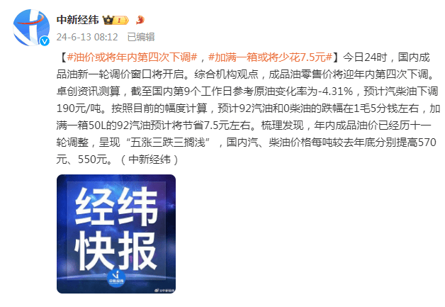 今日24时,国内成品油新一轮调价窗口将开启。综合机构观点,成品油零售价将迎年内第四次下调。卓创资讯测算,截至国内第9个工作日参考原油变化率为-4.31%,预计汽柴油下调190元/吨。按照目前的幅度计算,预计92汽油和0柴油的跌幅在1毛5分钱左右,加满一箱50L的92汽油预计将节省7.5元左右。梳理发现,年内成品油价已经历十一轮调整,呈现“五涨三跌三搁浅”,国内汽、柴油价格每吨较去年底分别提高570元、550元。(中新经纬)
