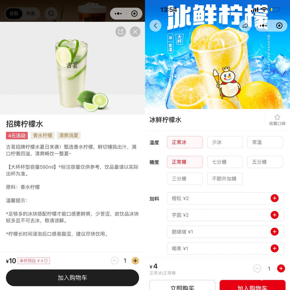 古茗小程序显示,招牌柠檬水原价10元,但目前为“4元活动”期间,一杯590mL,原料为香水柠檬。除了招牌柠檬水,古茗含有柠檬的饮品还有“大力鸭香柠茶”,售价14元。对于同样采用香水柠檬的柠檬水,古茗的售价比蜜雪冰城便宜1元,但杯量少了70mL。