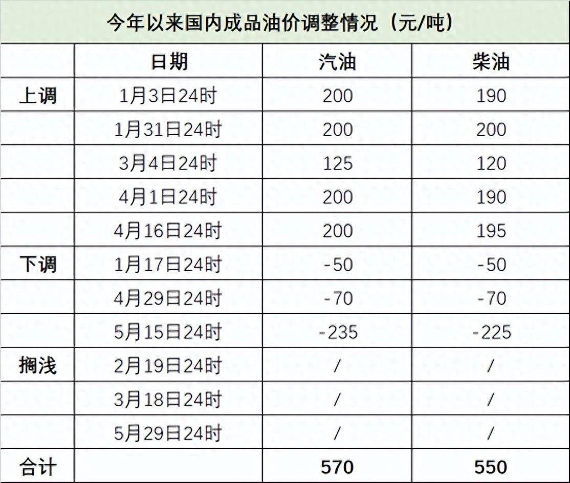 今年以来,国内油价调整共经历了“五涨三跌三搁浅”,整体涨多跌少,汽、柴油价格每吨较2023年底分别提高了570元、550元。若本次价格下跌,将成为2024年的“第四降”。