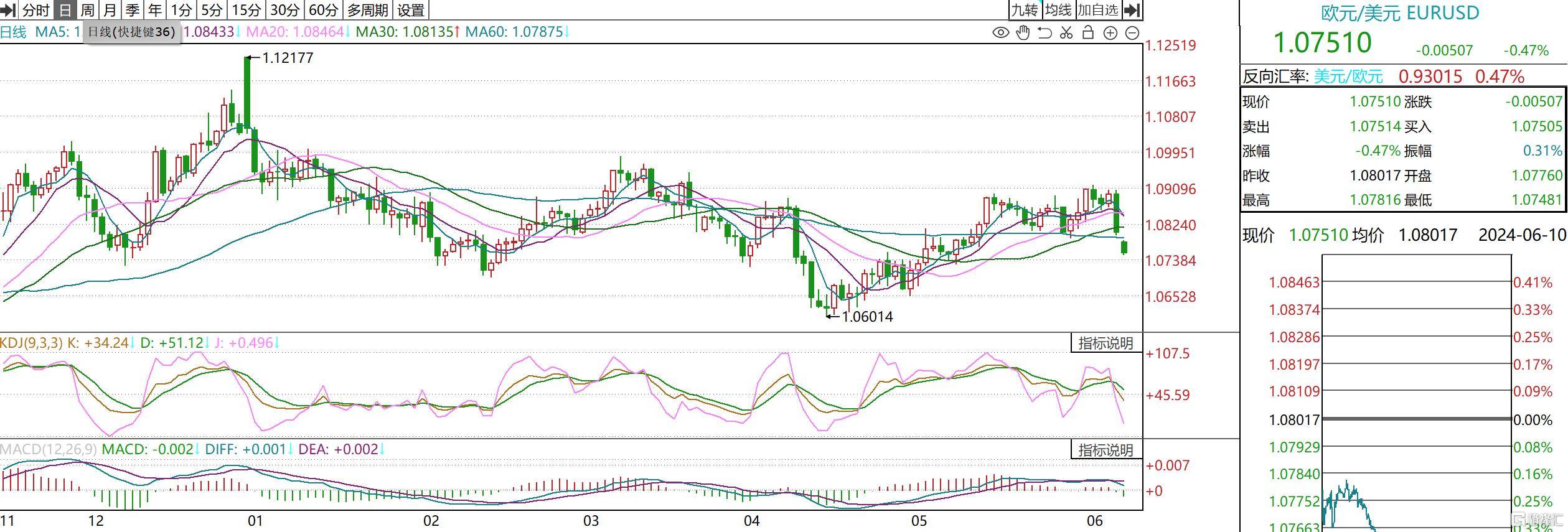 受政治不稳定因素影响,欧元兑美元汇率周一下跌0.47%,报1.07510,最低触及1.07481,跌至一个月来新低。