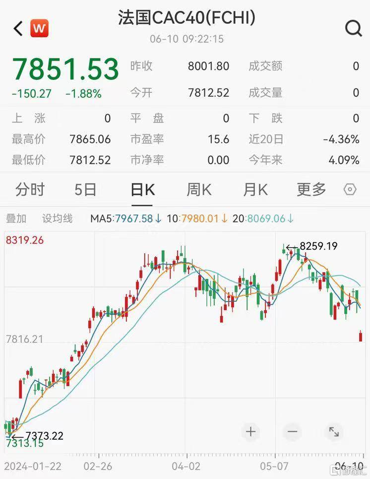 法国CAC40指数一度超2%,最低报7812.52点,现跌幅收窄至1.88%。